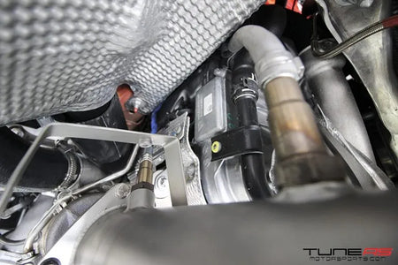 DEVELOPMENT AND TESTING: We selected 3″ diameter piping to maximize exhaust flow and the sound of the turbos spooling – and oh do you hear them now. It was also important that we retain use of the factory heat shields as to not heat soak the components around the turbos. As expected, there are large gains to be had when pairing the free flowing bypass pipes with an ECU Tune.