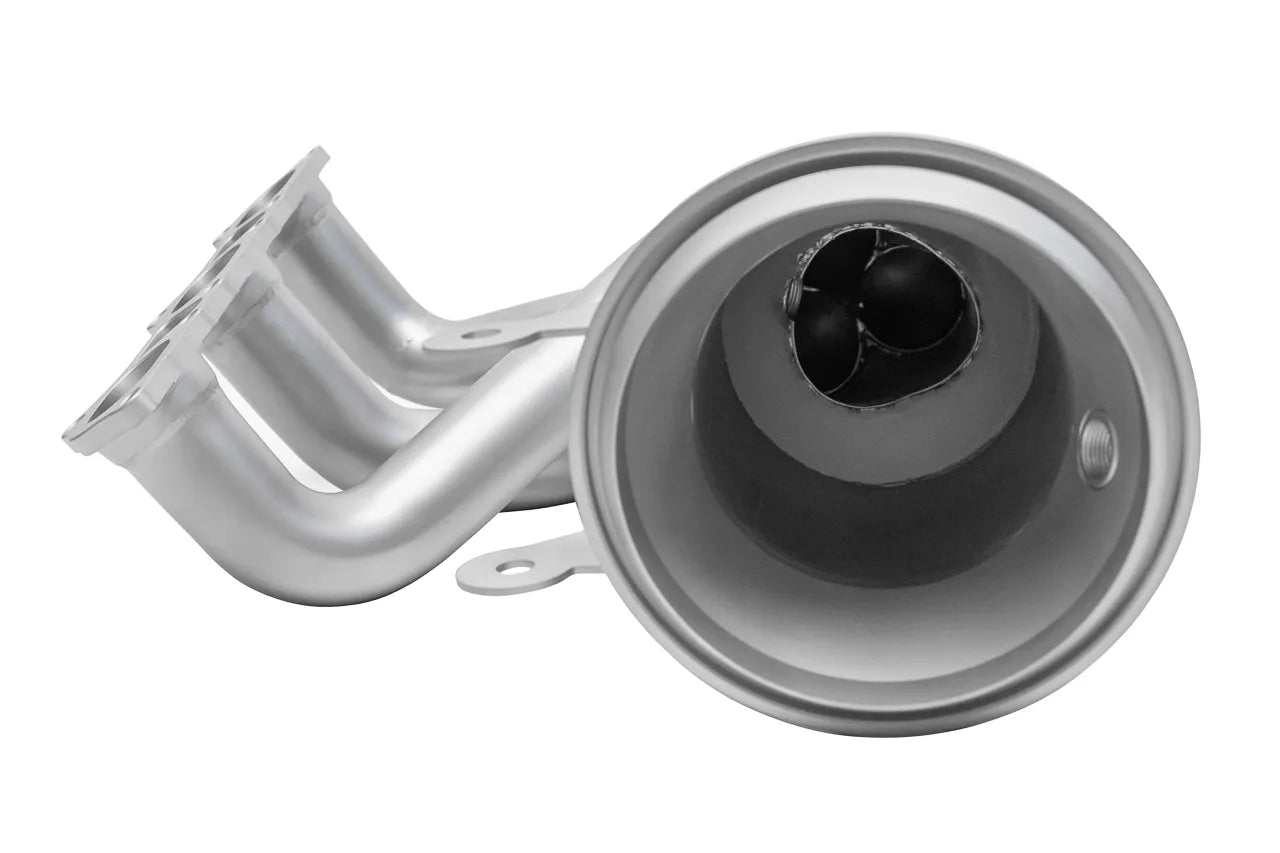 For immediate results, addressing the restrictive factory headers is the place to start, where the assembly houses catalytic converters and particulate filters—naturally stymying the flow of exhaust through the system. Our replacement is built with optimized cast flanges and runners for maximum gains in power, throttle response, and tone from the 992 GT3’s 4.0-liter flat-six. The resulting sound change is a significant amplification of the system mounted rearward, a proper emphasis on the flat-six’s sound as intended, and built to withstand aggressive driving in the most demanding environments.